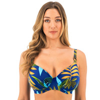 Perfect island vibes await you with this gorgeous bikini top from Fantasie's tropical-inspired Pichola collection! This range is playful and vibrant, with a fabulous tropical print, provoking images of long days by the beach with the waves gently lapping against the shore. The gathered full cup coverage gives you an extremely flattering fit, and the concealed side sling and powernet lined wings will hold you securely, giving you the confidence to enjoy the sun and the sea all day long! Fully adjustable straps and a back clasp closure give you an individualised fit. The coconut ring detail at the apex finishes this piece wonderfully. You can enjoy mixing and matching with the coordinating pieces also found in the Pichola range to complete this stunning look.
