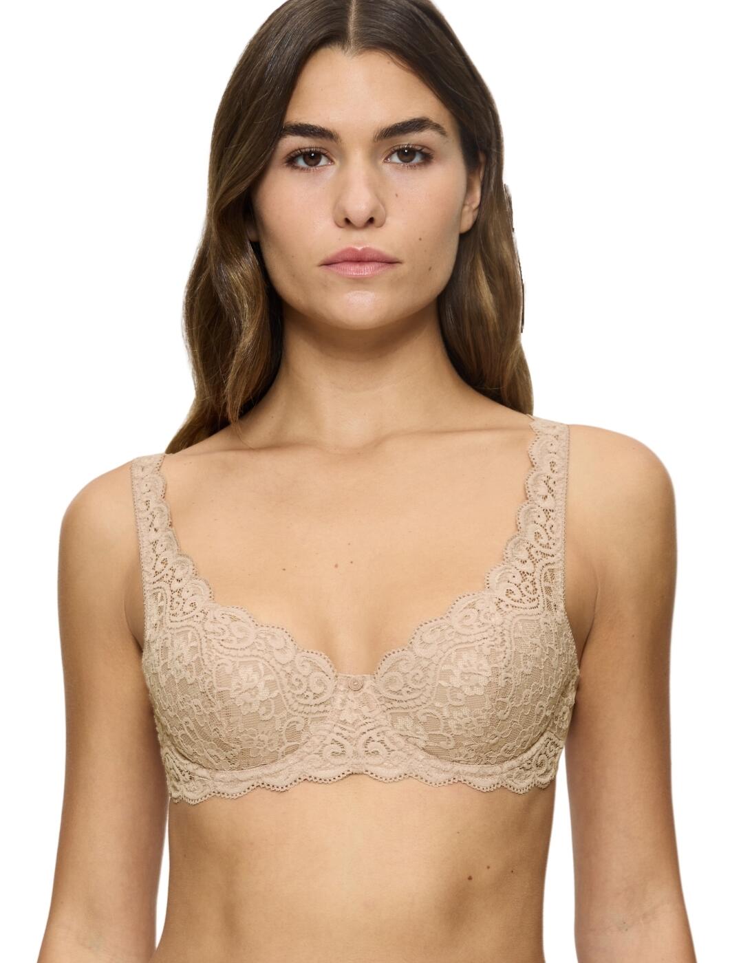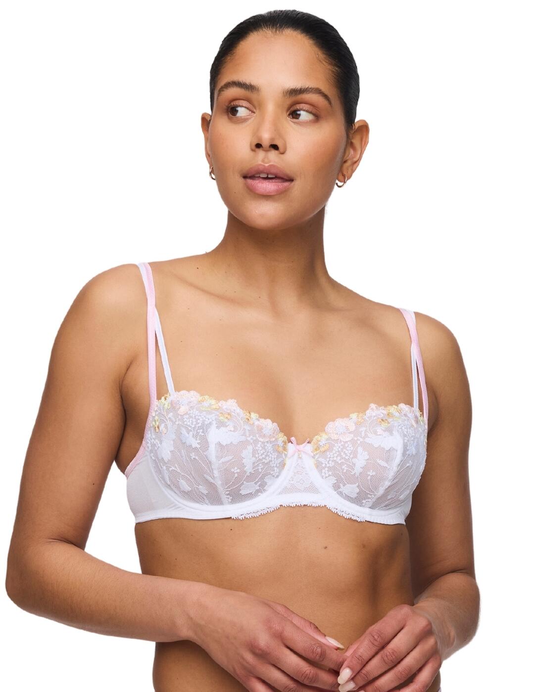 Immerse yourself in enchanting lingerie with the Blossom balcony bra by Panache. Showcasing captivating daisy embroidery for a delicate, semi-sheer look, this must-have bra combines style and functionality thanks to a supportive underwire and flattering balcony shape with no padding. Feminine lacy cups are rigid and lined at the bottom to lift your bust and enhance your curves, while decorative edges along the neckline add a touch of allure. For a bespoke fit, the bra offers fully adjustable shoulder straps and a secure hook-and-eye closure at the rear to guarantee custom comfort. Wear with matching Blossom lingerie for effortless elegance in your everyday lingerie.