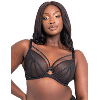 Steal the show in this stunning plunge bra brought to you from the Senses range by Scantilly by Curvy Kate. Rigid satin seams that coat the cups create a structure to the sheer stretch mesh. Underwiring within the cups creates support as well as a beautiful uplift, flawlessly displayed by the plunging neckline. No padding in the cups creates an exposed style, whilst obscured by the piping, for a comfortable yet enticing look. Overbust strapping detailing continues the theme throughout the piece whilst adding a bondage-inspired addition. Wide mesh wings create dreamy support as well as comfort. Fully adjustable straps combined with a hook and eye closure means you can find your perfect fit.