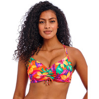 Hit the beach with confidence this season thanks to the Sun Haze bralette bikini top by Freya. Designed for those searching for a tropical twist on a classic style, this bikini top offers a vibrant print to transport you to swimwear paradise. Comfort isn't compromised with non-padded, lined cups providing natural support and a concealed underwire ensuring all-day security, whether you're catching rays by the pool or exploring the beach. At the centre front of the top, the ruching tie allows customisable bust coverage and adds a gathered fabric effect so your look is always personalised and flattering. Adjustable, multiway shoulder straps and a secure plastic clasp closure work with concealed stitching to complete this holiday essential, which can be paired with matching Sun Haze swimwear for a show-stopping poolside ensemble.